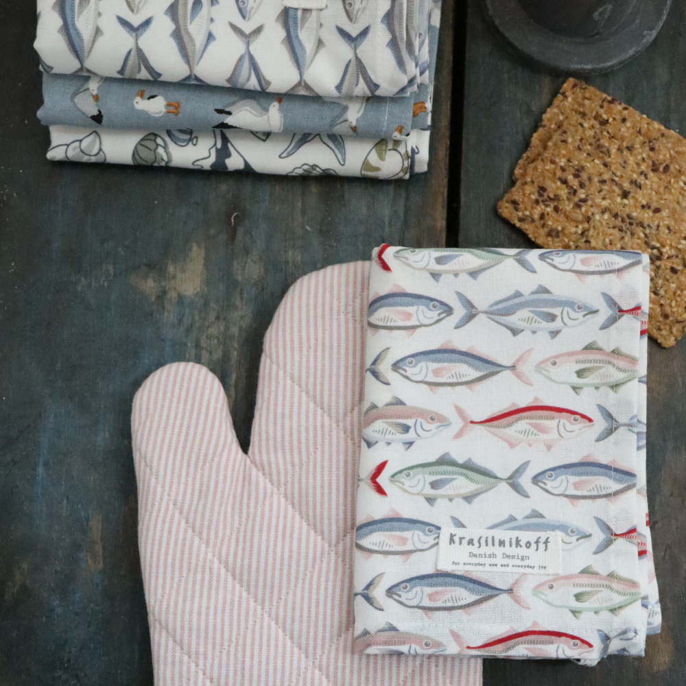 The Krasilnikoff tea towels for everyday use and everyday joy. They are available in many beautiful patterns, colours and designs. They can be mixed and matched with a large selection of porcelain, zinc products and other textiles. To reduce wrinkles and increase the absorbency factor of your tea towels, soak them in cold water for 24 hours before the first wash.