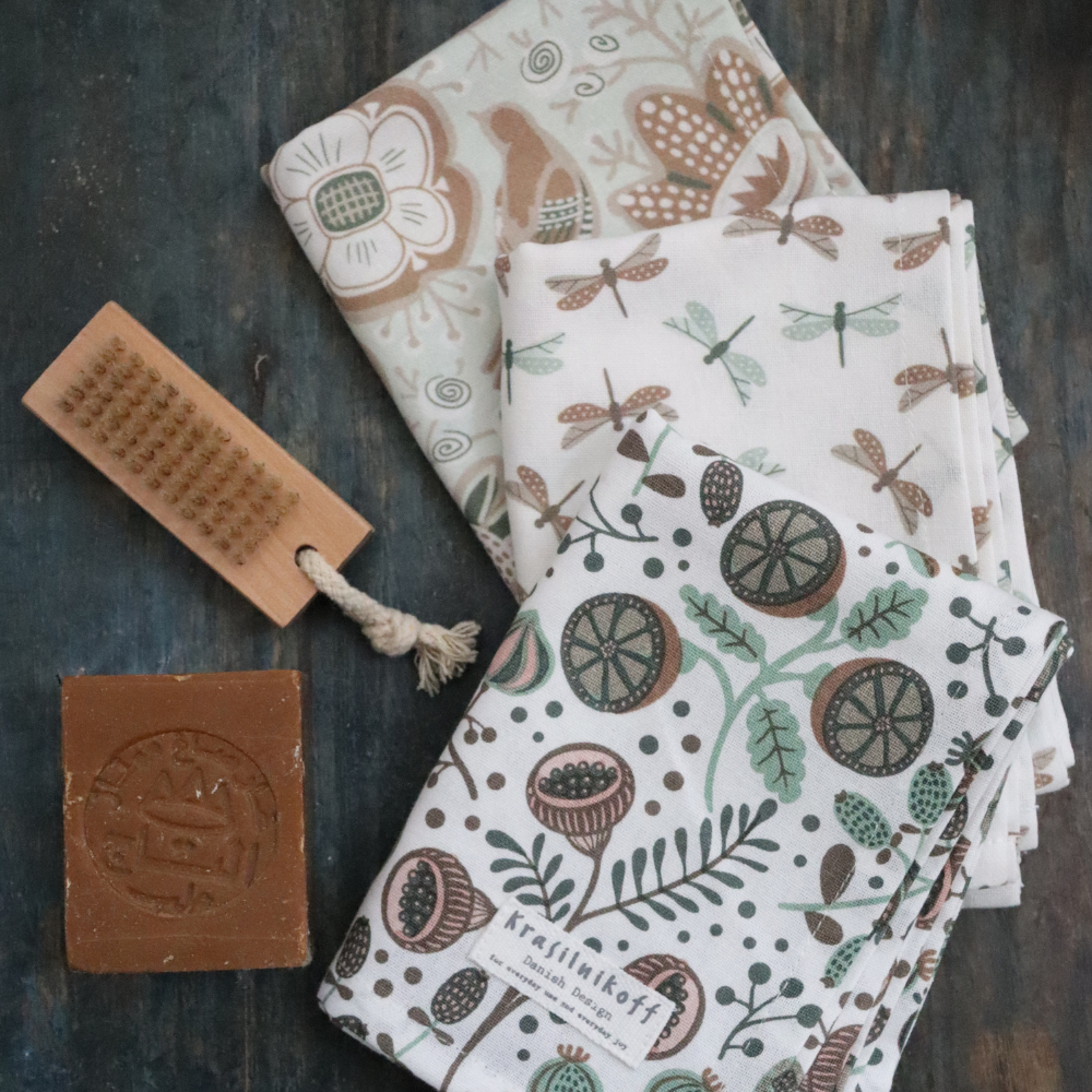 The Krasilnikoff tea towels for everyday use and everyday joy. They are available in many beautiful patterns, colours and designs. They can be mixed and matched with a large selection of porcelain, zinc products and other textiles. To reduce wrinkles and increase the absorbency factor of your tea towels, soak them in cold water for 24 hours before the first wash.