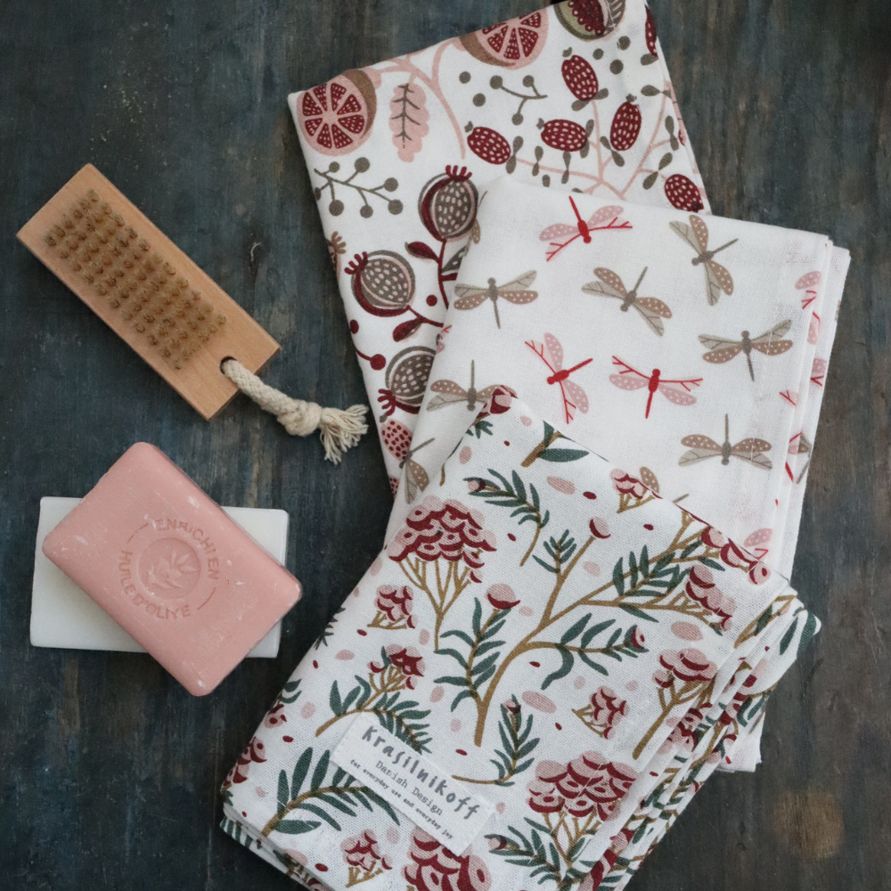 The Krasilnikoff tea towels for everyday use and everyday joy. They are available in many beautiful patterns, colours and designs. They can be mixed and matched with a large selection of porcelain, zinc products and other textiles. To reduce wrinkles and increase the absorbency factor of your tea towels, soak them in cold water for 24 hours before the first wash.