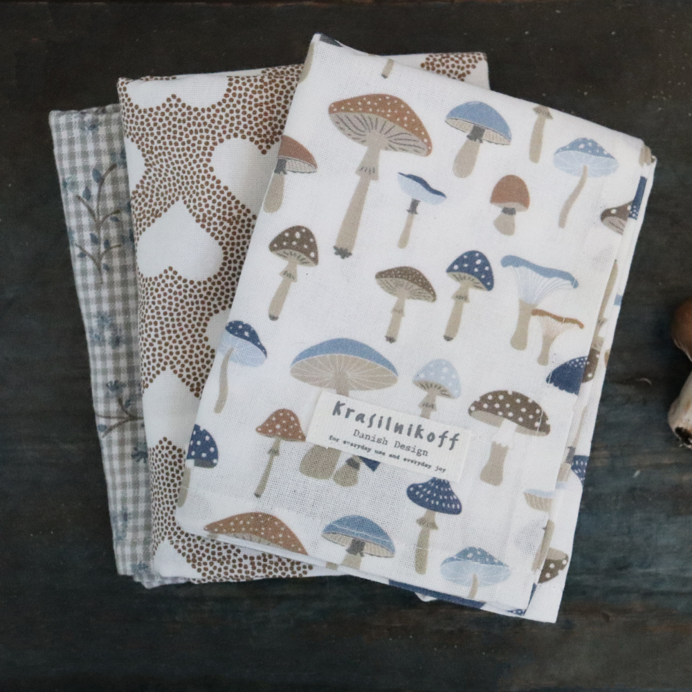 The Krasilnikoff tea towels for everyday use and everyday joy. They are available in many beautiful patterns, colours and designs. They can be mixed and matched with a large selection of porcelain, zinc products and other textiles. To reduce wrinkles and increase the absorbency factor of your tea towels, soak them in cold water for 24 hours before the first wash.