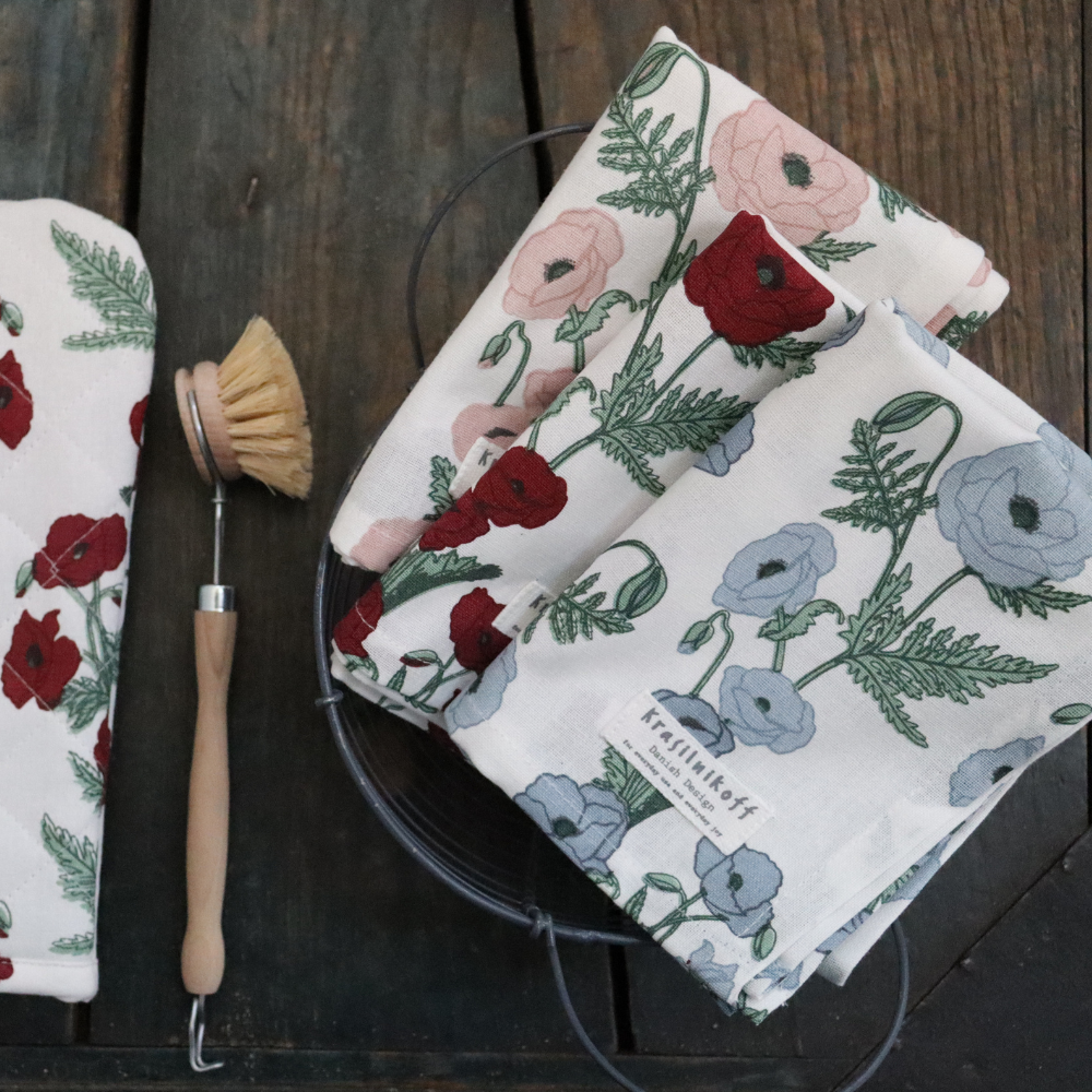 The Krasilnikoff tea towels for everyday use and everyday joy. They are available in many beautiful patterns, colours and designs. They can be mixed and matched with a large selection of porcelain, zinc products and other textiles. To reduce wrinkles and increase the absorbency factor of your tea towels, soak them in cold water for 24 hours before the first wash.