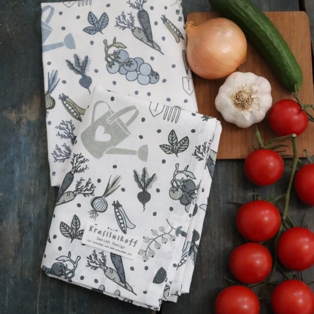 The Krasilnikoff tea towels for everyday use and everyday joy. They are available in many beautiful patterns, colours and designs. They can be mixed and matched with a large selection of porcelain, zinc products and other textiles. To reduce wrinkles and increase the absorbency factor of your tea towels, soak them in cold water for 24 hours before the first wash.